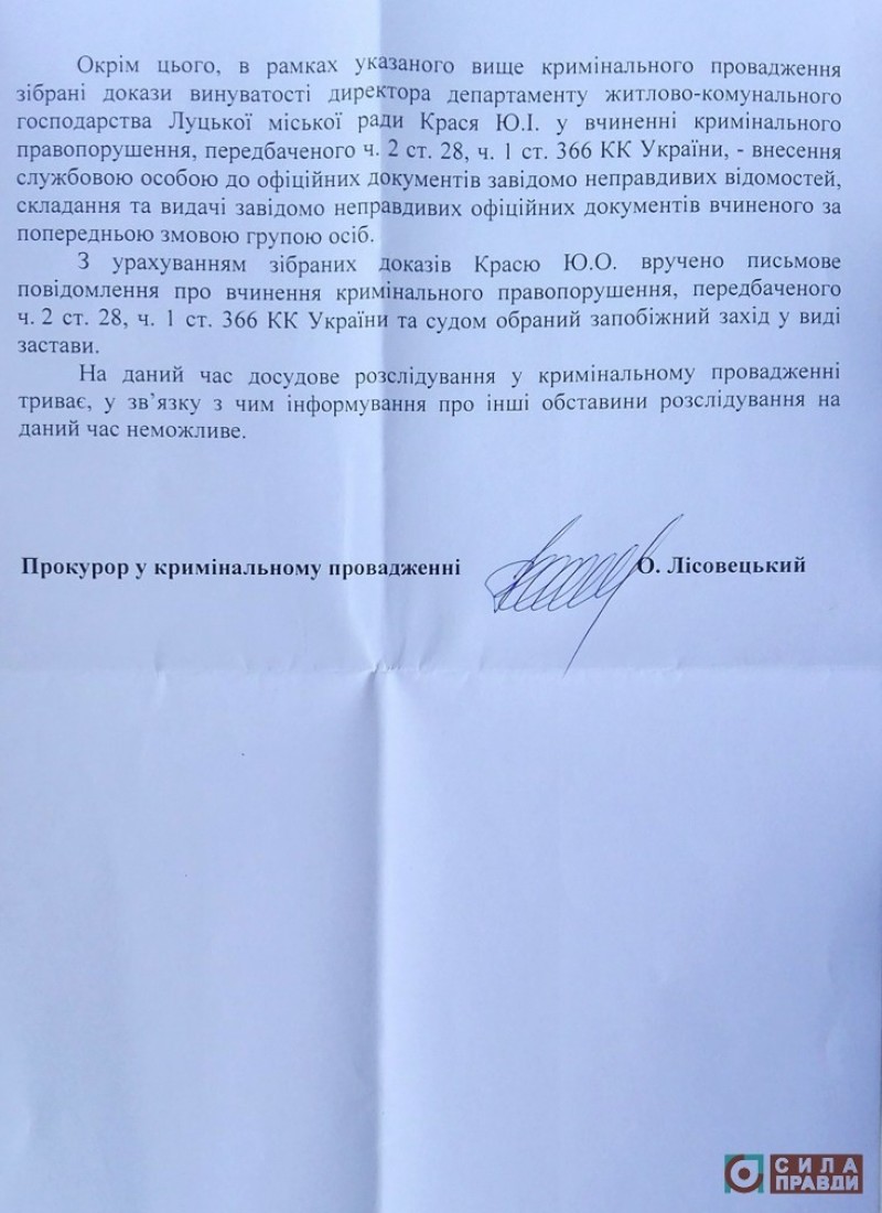 «В рамках кримінального провадження зібрані докази винуватості директора Департаменту житлово-комунального господарства Луцької міської ради Крася Ю.І. у вчиненні кримінального правопорушення передбаченого ч.2 ст.28, ч. 1 ст. 366 КК України (внесення службовою особою до офіційних документів завідомо неправдивих відомостей, складання та видачі завідомо неправдивих офіційних документів вчиненого за попередньою змовою групою осіб). З урахуванням зібраних доказів Красю Ю.І. вручено письмове повідомлення про вчинення кримінального правопорушення <…> та судом обраний запобіжний захід у виді застави», – йдеться у письмовій відповіді прокурора Олега Лісовецького.