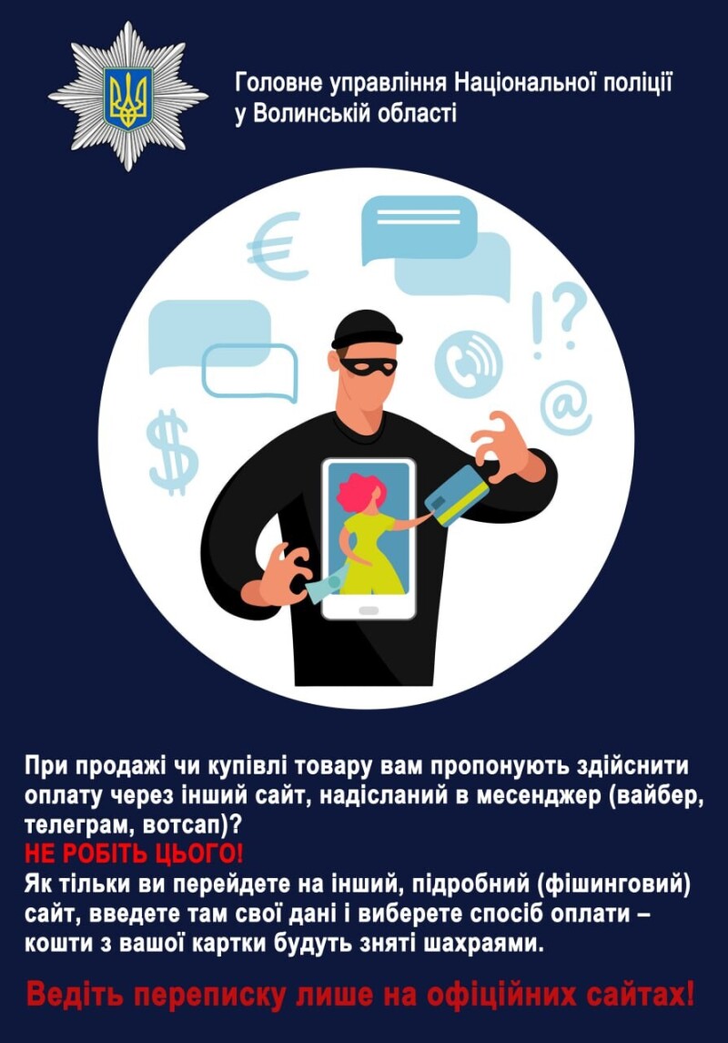 Правоохоронці звертаються до громадян: не переходьте на посилання, які вам надсилають в соціальних мережах, ведіть переписку лише на офіційному ресурсі з купівлі-продажу. Не вводьте конфіденційні дані банківської картки будь-де.