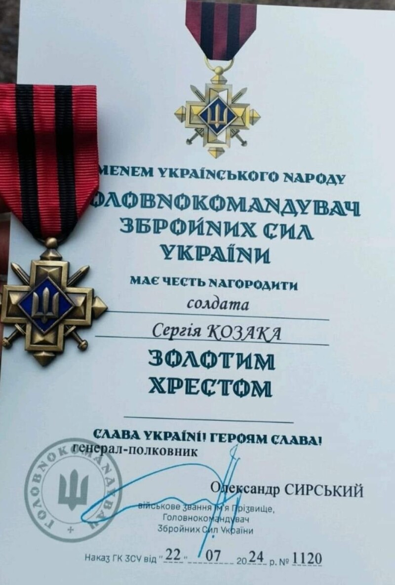 Воїн з Волині Сергій Козак отримав відзнаку «Золотий хрест» від Головнокомандувача Збройних Сил України Олександра Сирського.