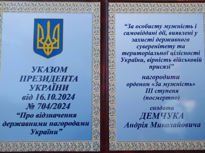 За особисту мужність і самовіддані дії, виявлені у захисті державного суверенітету та територіальної цілісності України, вірність військовій присязі, солдата Андрія Демчука зі Старовижівської громади нагороджено орденом «За мужність» ІІІ ступеня посмертно.