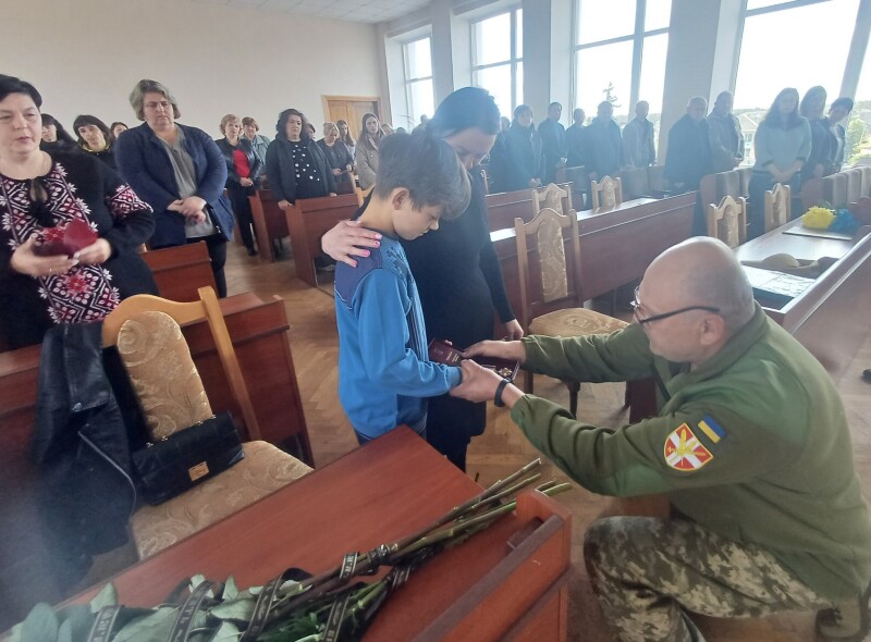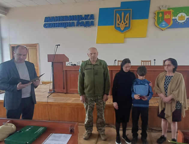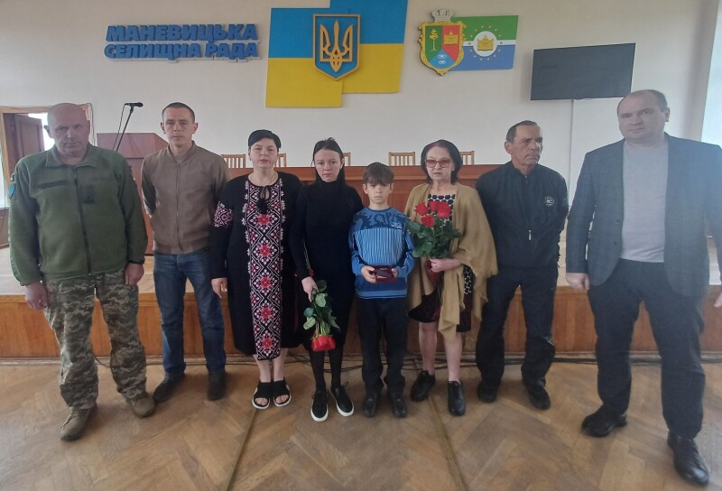 Сьогодні у приміщенні Маневицької селищної ради, старший офіцер Першого відділення Камінь-Каширського районного територіального центру комплектації та соціальної підтримки, майор Олександр Антонюк вручив дружині Карині Сергіївні і сину Марку почесну державну нагороду.
