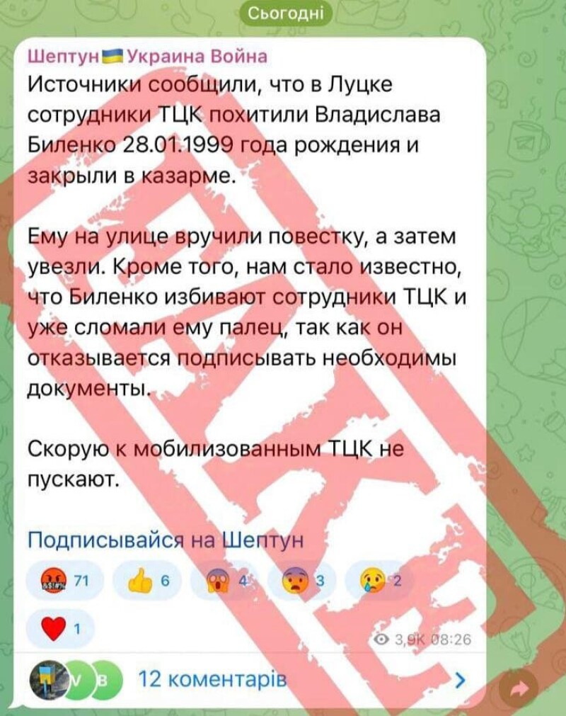 Група комунікацій Волинського ОТЦК та СП називає цей телеграм-канал сумнівним, а інформацію, оприлюднену там – фейковою й повною нісенітницею.
