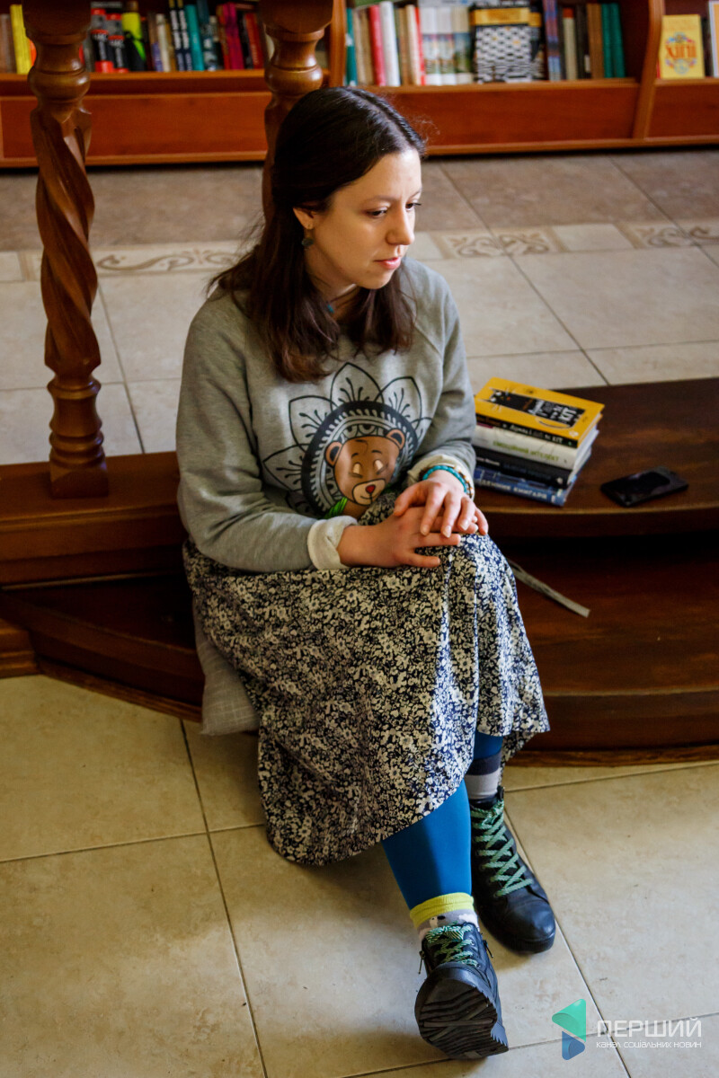 У День книги, 23 квітня, ми зустрічаємося з Катею просто в книгарні. Сідаємо на сходинки. Відставляємо в бік паперові скляночки кави. Я помічаю, що у неї… різні шкарпетки.