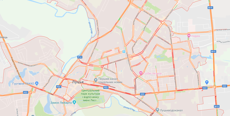 За даними картографічних сервісів, вулиць, де можна проїхати без жодних затримок – майже немає. Більшість основних доріг Луцька позначені на карті оранжевим кольором, що означає – проїзд там ускладнений.
